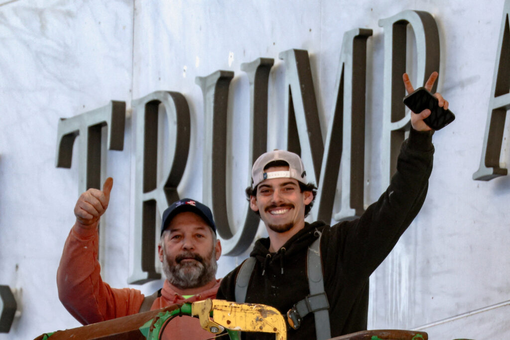 Workers react to media watching the installation of U.S. President Donald Trump's name in the facade of the John F. Kennedy Center for the Performing Arts, a day after its board announced it would rename the institution The Donald J. Trump and The John F. Kennedy Memorial Center for the Performing Arts, in Washington, D.C., U.S., December 19, 2025. REUTERS/Kevin Lamarque TPX IMAGES OF THE DAY