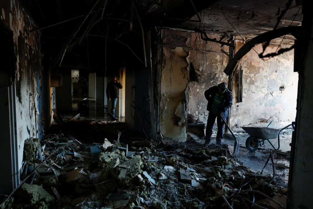 Employees remove debris at the site of a private hospital hit by Russian drone strikes, amid Russia's attack on Ukraine, in Kyiv, Ukraine January 5, 2026. REUTERS/Valentyn Ogirenko