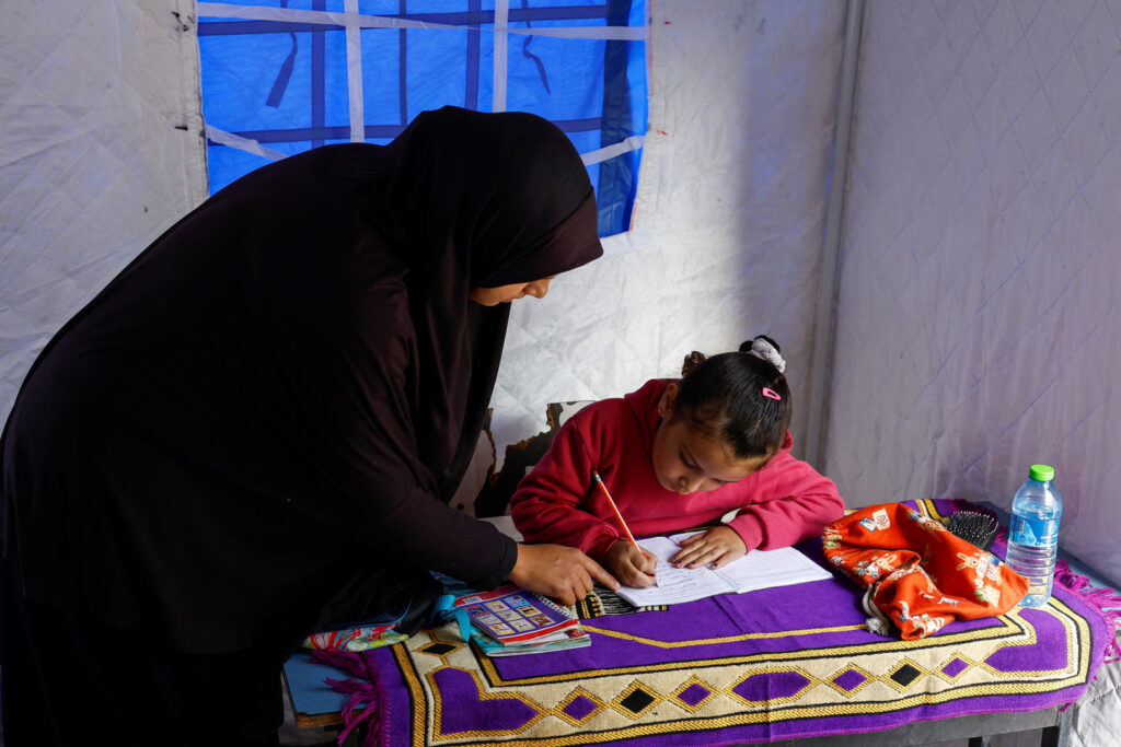 Displaced Palestinian mother, Yasmine Al-Aajouri, helps her seven-year-old daughter Toulin Al-Hindi with her homework inside their tent near the Israeli-designated "yellow line", in Beit Lahiya, northern Gaza Strip, January 6, 2026. REUTERS/Mahmoud Issa