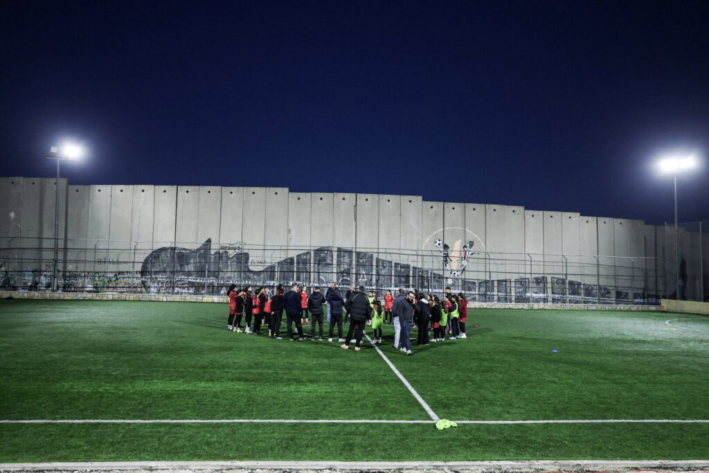 Palestinian camp football team stands in a field ahead of game, next to Israeli barrier separating Aida refugee camp from Jerusalem, in Bethlehem, in the Israeli-occupied West Bank, January 11, 2026. REUTERS/Ammar Awad