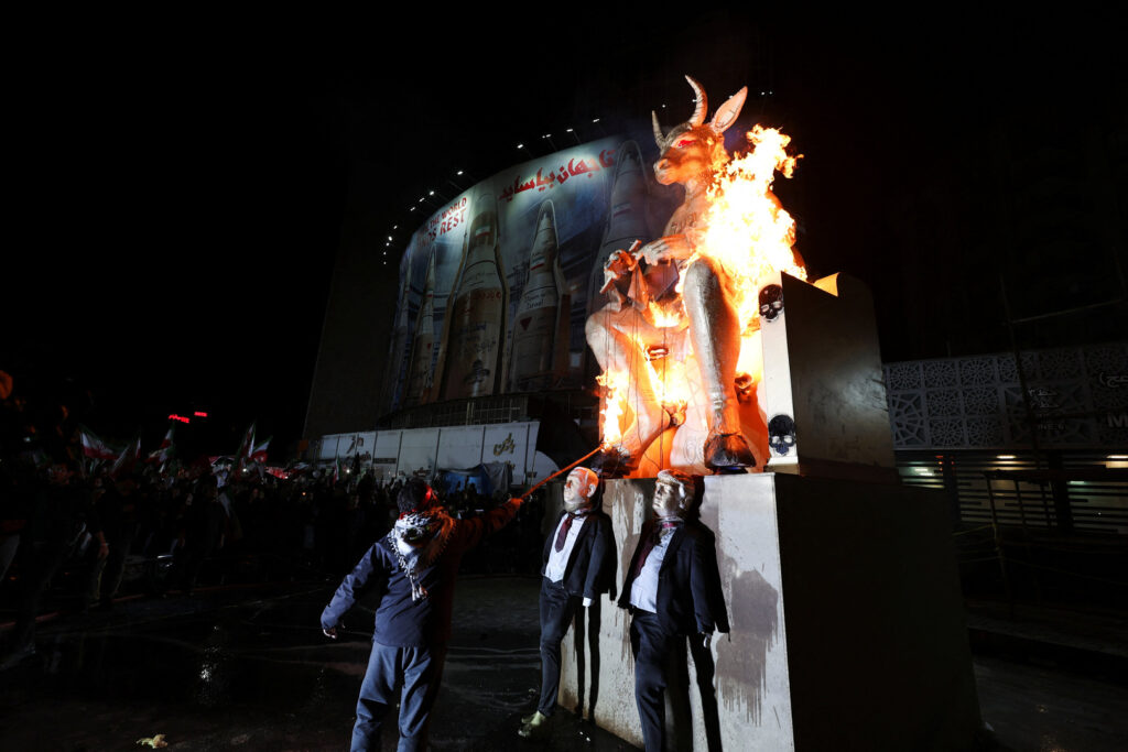 A man sets fire to figures depicting U.S. President Donald Trump and Israeli Prime Minister Benjamin Netanyahu during an anti-U.S. and anti-Israel rally at Valiasr Square, in Tehran, Iran, March 17, 2026. REUTERS/Alaa Al Marjani
