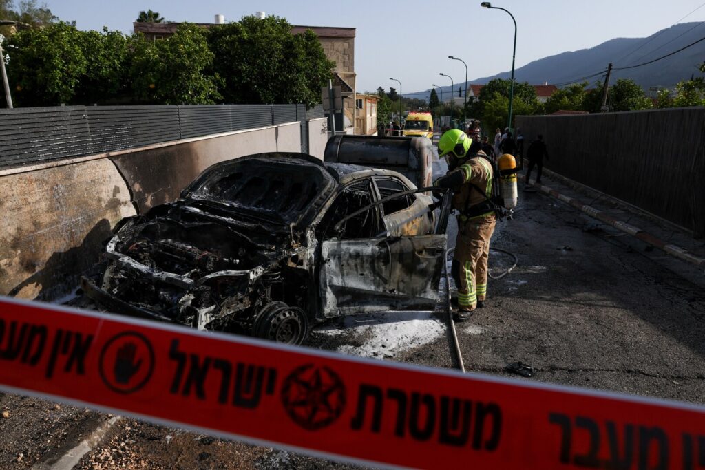 A firefighter uses an hose at an impact site, in Kiryat Shmona, Israel, April 16, 2026. REUTERS/Florion Goga