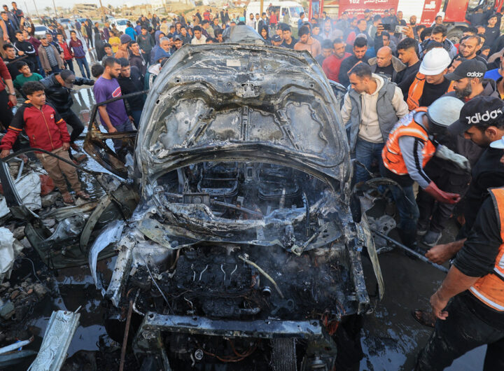 Vehicle Engulfed in Flames Following Israeli Drone Strike in Central Gaza Vehicle Engulfed in Flames Following Israeli Drone Strike in Central Gaza